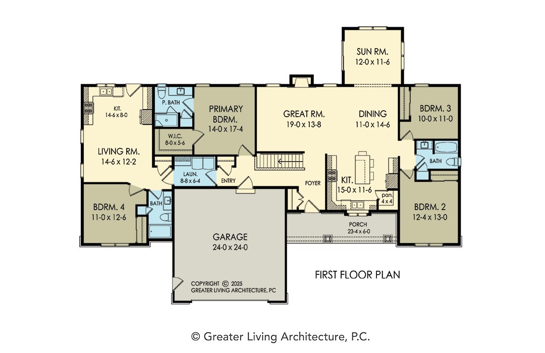 The main home features an open great room with abundant natural light, a large kitchen with a functional island, and a dining area that flows seamlessly into the bright sunroom. The primary bedroom suite offers a generous walk-in closet and private bath, while three additional bedrooms provide options for family, office space, or hobbies. A dedicated laundry room, mudroom, and walk-in pantry add everyday convenience.